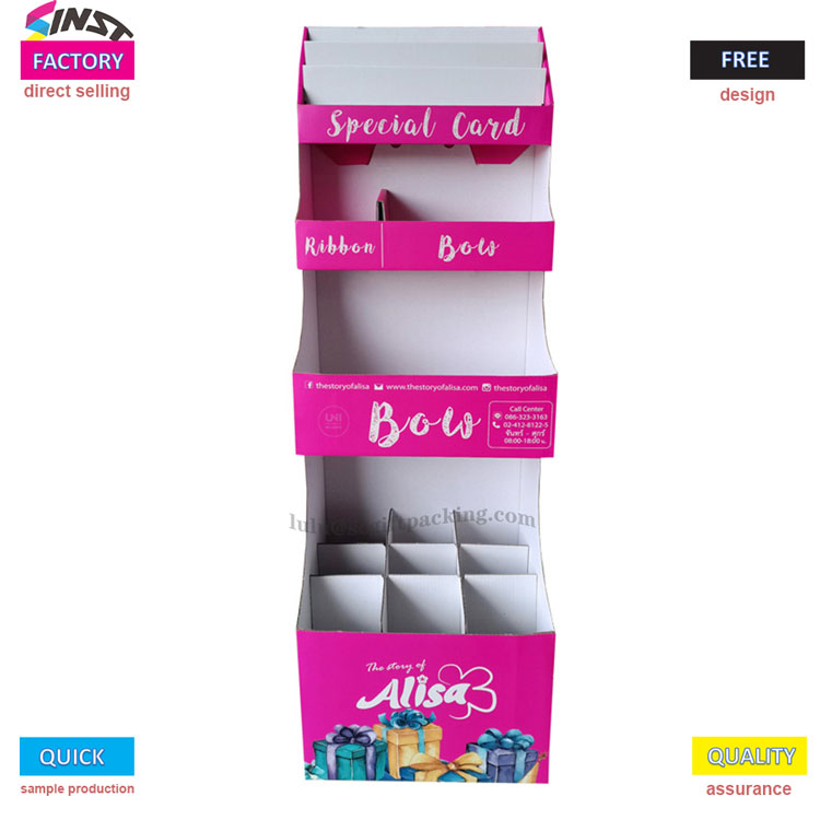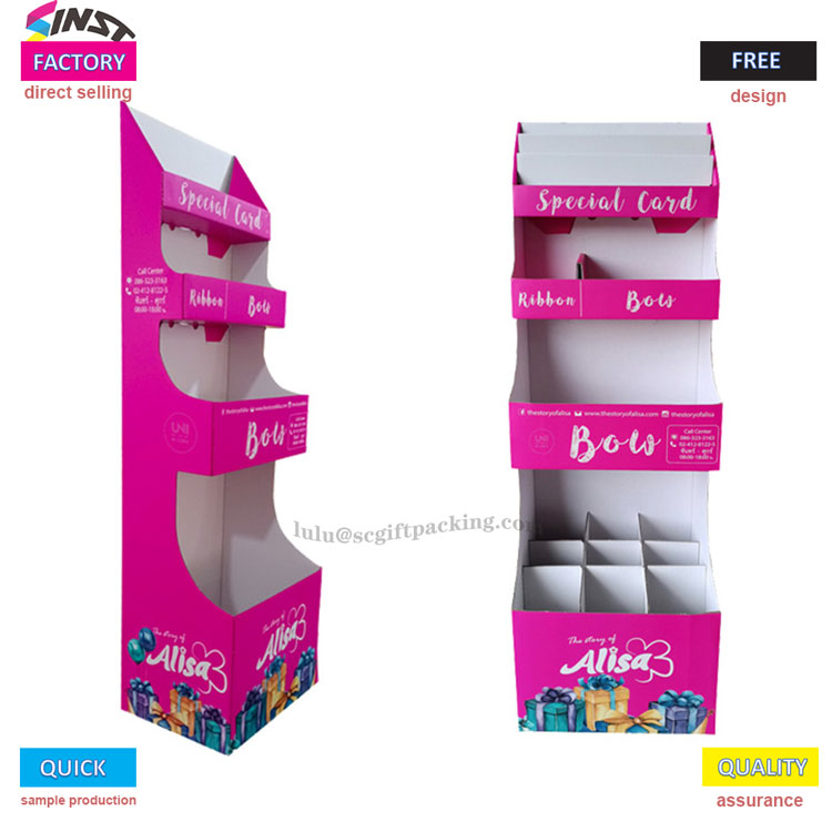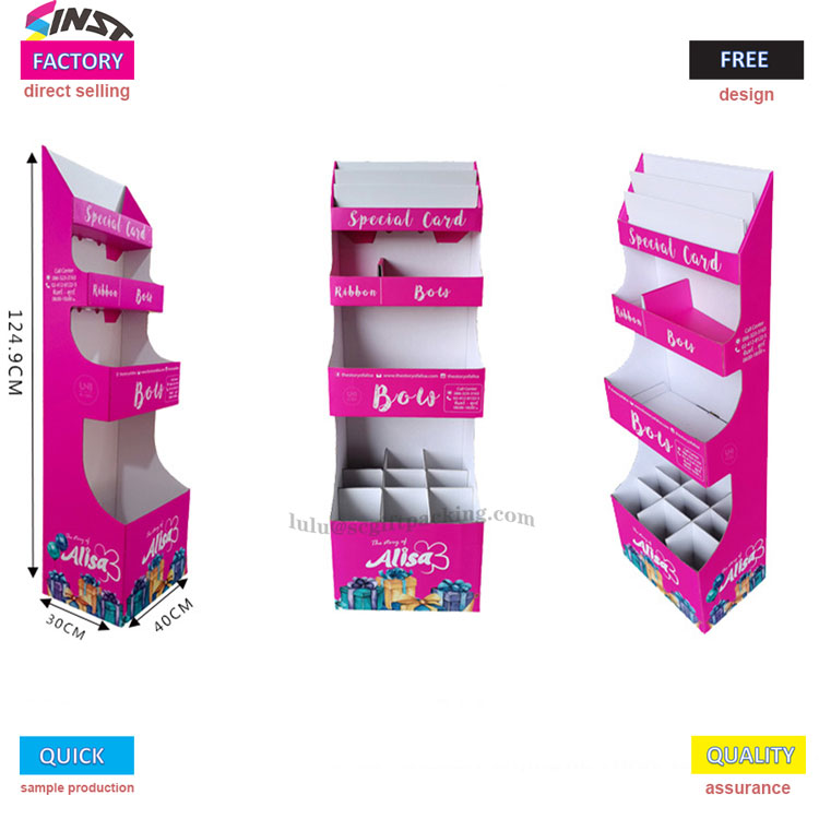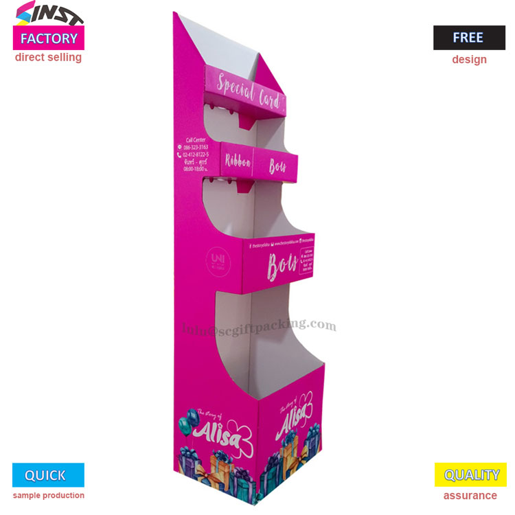 „Blind Box“ žaislų kartono vitrinos stovo stovas pasižymi dideliu sodrumo rožine spalva kaip pagrindinis spalvų tonas, suporuotas su dinamiškais dovanų dėžutės modeliais ir prekės ženklo logotipais, sukeliančiu jaunatvišką ir madingą pojūtį, lengvai patraukdamas madingų žaislų entuziastų dėmesį. Trijų sluoksnių trijų matmenų struktūros mokslinis zonavimas: Viršutiniame sluoksnio srityje gali būti rodomos riboto leidimo kortelės arba surinkimo sertifikatai, vidurinis sluoksnis yra tinkamas ženkleliams, pakabinamiems aksesuarams ir kitiems priedams, o apatinis sluoksnis yra suprojektuotas su keliais atvirais skyriais, specifiniais aklųjų dėžutės korpusui. Dėl suskirstyto išdėstymo produkto hierarchija iš pirmo žvilgsnio aiškina ir skatina tyrinėjimo norą.