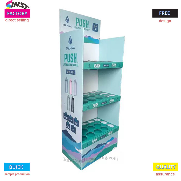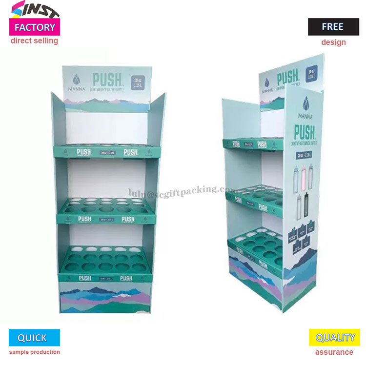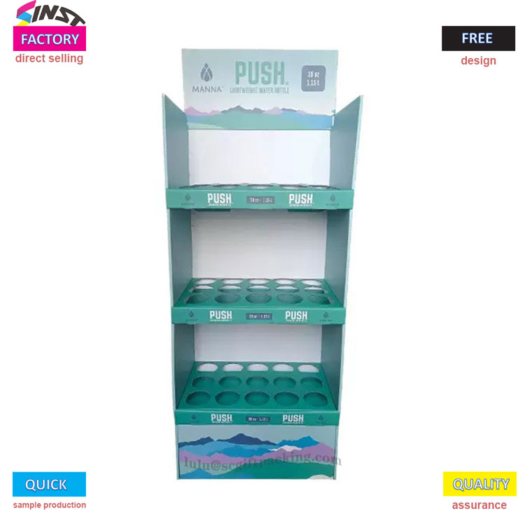 Šiame kartono dėžutės grindų ekrane „Supermarke“ vandens buteliui yra trijų sluoksnių tinklelio konstrukcijos konstrukcija, kurios kiekviename sluoksnyje yra apskrito grioveliai, kad būtų tiksliai laikoma vandens buteliu ir užkirstų kelią riedėti. Prekės ženklo logotipą galima atspausdinti viršuje, o produktų grafika gali būti atspausdinta iš šono, paprasta ir aukščiausia. Daugiausia naudojami gaminiams, tokiems kaip vandens buteliai, puodeliai, pieno arbatos puodeliai, termoso puodeliai ir kt.
