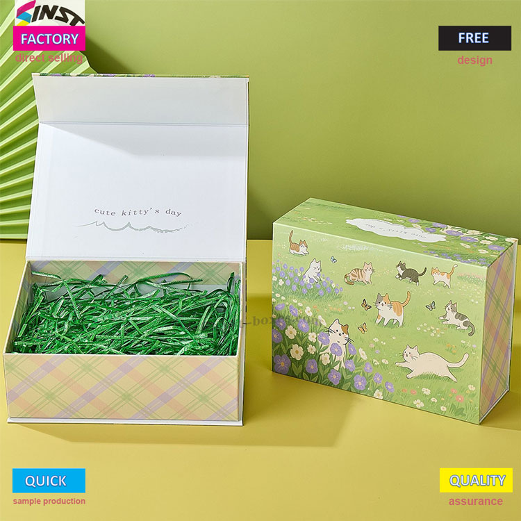 Ši pliušinio pakabuko dovanų dėžutė yra miela ir gydančio stiliaus, derinama su šviesiai žaliais ir smėlio spalvos languotais raštais, todėl žmonės iš pirmo žvilgsnio jaučiasi geriau. Cute Cat pliušinių pakabukų dovanų dėžutė pagaminta iš storo kartono, kuris yra kvadratinis ir lengvai nesideformuoja, nesutraiškys montuojant pliušinius pakabukus ar raktų pakabukus. Atidarymo būdas yra labai ypatingas, su apverčiamu dizainu ir žaliu Lafite pamušalu, suteikiančiu ceremonijos pojūtį atidarant dovanas, pvz., raudonus vokus.