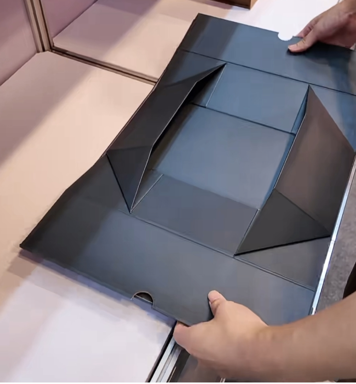 Ši sulankstoma popierinė dėžutėdaugiausia yra tamsiai pilkos spalvos, su plokščiu paviršiumi, bet paslėptu išradingumu - dėžutės korpuse yra aiškios dalijimosi plotai (kaip parodyta 1 paveiksle), kurios vartotojams leidžia lengvai išsiskleisti ar sulankstyti per raukšles. Veikdami palaikykite abi galus abiem rankomis ir švelniai stumkite juos, kad popierinė dėžutė iš plokščios būsenos transformuotų į trijų matmenų laikymo dėžę, sutaupydama 70% transportavimo vietos.